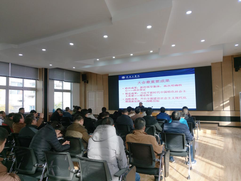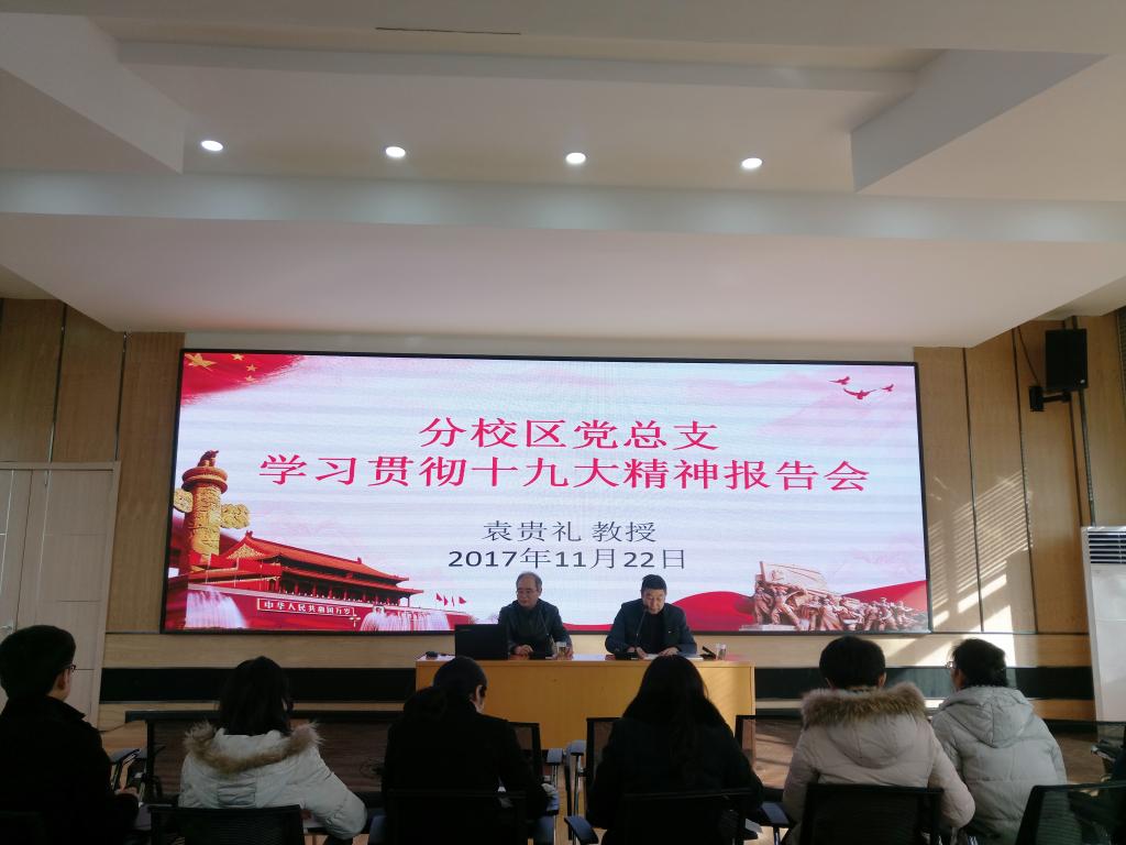 根据学校党委统一部署,11月22日下午,校宣讲团成员,马克思主义学院教授袁贵礼到分校区为教职工作十九大精神专题宣讲报告。报告会在多功能路演大厅举行,分校区党总支书记吕振华主持会议。分校区管委会、大学科技园、村官研究所、江苏省海洋资源开发研究院的全体教职工参加报告会。