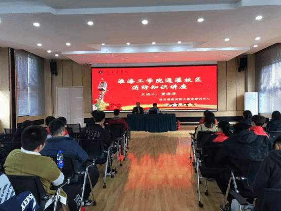 此次讲座特别邀请了连云港政安防火教育培训中心的董海涛教官来主讲,学生代表、食堂负责人、驻校区各单位负责人、物业人员和保卫科全体人员参加了此次讲座。讲座的主要包含:高楼发生火灾自救、煤气天然气如何安全使用,火情紧急情况处置、自救与报警、鉴别灭火器及正确使用灭火器。董海涛教官通过生动的讲解并结合全国各地火灾案例及PPT图片、视频播放,这些触目惊心的火灾场面,让参加聆听的每位人员深刻感受到火灾的无情及掌握消防安全知识的必要性。