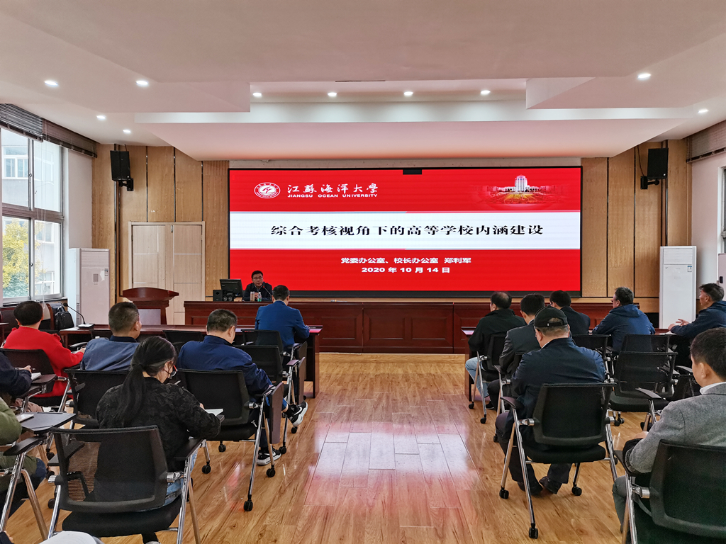 郑利军从考核背景、教育形势、学校要求、考核重点四个方面详细解读了学校制定综合考核的总体思考、模块设置、指标设计、机关考核工作的主要内容和相关要求等,他指出,在工作思路、指标选取、方案制定等方面,结合江苏省对学校的考核,为加强学校的内涵建设,制定综合考核办法,,考核主要包括:高质量发展考核、加强党的建设年度成效考核、服务保障高质量发展考核,其目的是希望各部门坚持以新发展理念为引领,突出发展的质量要求,紧扣学校“1+5”规划的贯彻落实。
