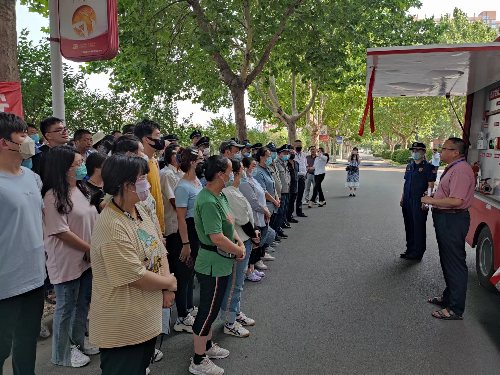 刘函如科长利用消防宣传车播放消防安全视频并通报了近期高校火灾案例及影响。她讲解了火灾的基本常识、火灾的危害、火灾报警及初起火灾扑救、安全灭火与火场逃生的常用方法与技巧、消防法律法规和各类消防器材的使用方法。为进一步提高培训效果加深印象,现场组织大家使用灭火器进行灭火演练,大家熟练掌握了灭火器、灭火毯等消防器材的使用方法。