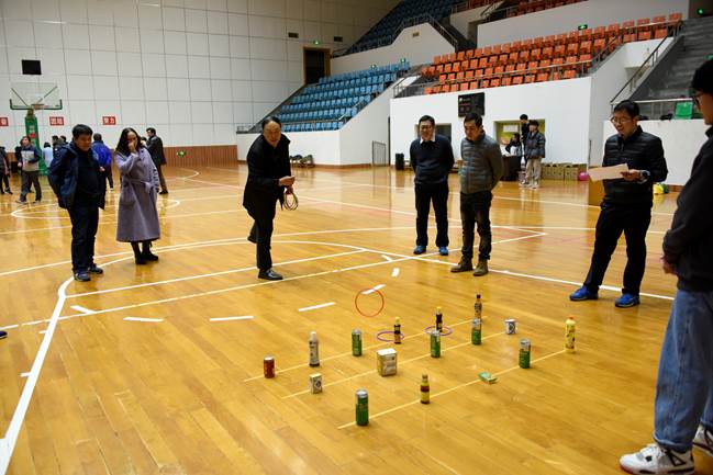 46名老师参加了8个项目的角逐,其中个人项目6项,集体项目2项,比赛项目形式丰富、内容有趣,且富有挑战性。套圈游戏的现场热闹非凡,轻盈的套环纷飞,不断套中物品,周围不时发出喝彩声;飞镖投掷是一项技巧游戏,动作要求均匀、连贯、流畅、一气呵成,比赛扣人心弦、精彩纷呈;跳绳、踢毽子考验的是大家的弹跳、有氧耐力和身体协调性,每位参赛者都拼尽全力,坚持到最后一秒,通过比赛大家都意识到加强体育锻炼的重要性;夹乒乓球是一项技术活,大家用筷子把盆里的乒乓球夹起,用最快、最稳的方法夹到指定区域;定点投篮是本次比赛的热门项目,参赛老师摩拳擦掌,跃跃欲试,许多老师球技非凡,不时投出精彩的进球,博得阵阵喝彩声。集体项目有气排球和三人四足两项,比赛中大家精神抖擞,热情高涨,配合默契,现场呐喊声、加油声此起彼伏,将本次运动会带入高潮。